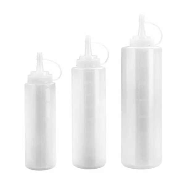 Flask doser i transparent, mjukt plast med graderad skala och kork. Idealisk för att dosera dina vätskor, den är diskmaskinsvänlig för enkel rengöring.