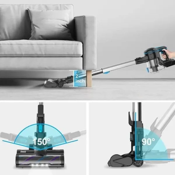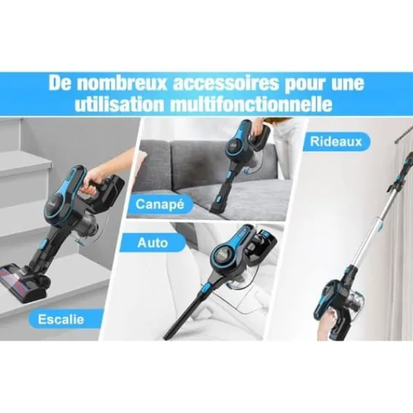 - Dammsugarens kapacitet: INSE trådlös stavdammsugare för djurhår, mattor, bil. Blå, multifunktion 6-i-1, 65 DB, 55 minuters driftstid, 25KPa, 5-lagers hög effektiv luftfiltrering; 1,2L dammbehållare; 4 LED-lampor; Flexibel rotation.