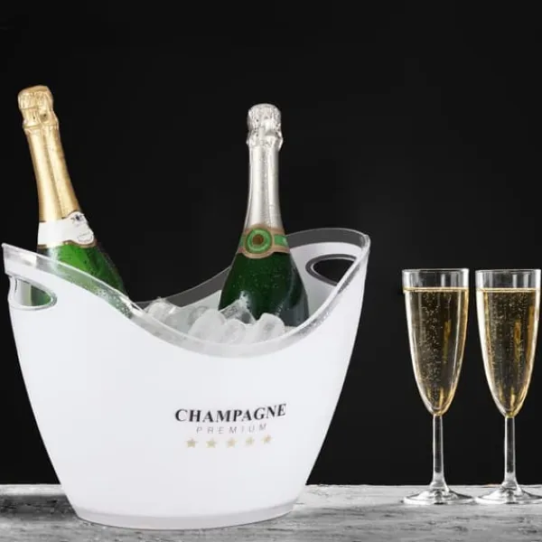 Detta eleganta vita champagnekylare är perfekt för att hålla dina drycker kylda och stilfullt presenterade vid alla tillfällen. Den robusta plastkonstruktionen och rymliga designen gör den idealisk för fester, då den enkelt rymmer flera flaskor. Praktiska bärhandtag gör transporten enkel var du än behöver den.