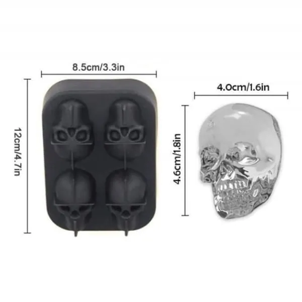 ”Isformaren för isbitar ger mer glädje i ditt liv, fyra formade skalleisbitar. Förändra utseendet på din drink i toppklass. Specifikation: Lätt att rengöra. Hög temperaturbeständighet: den kan motstå höga temperaturer.”