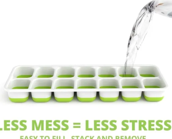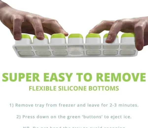 Flexibla silikonformar möjliggör knapptryckning för enkel isutlossning efter 2 minuters avtining.Medföljande stapellock skyddar mot spill vid fyllning och fryslukter samtidigt som de möjliggör vertikal stapling.