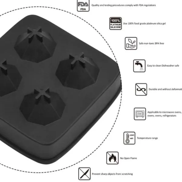 Svalkar garanterat din drink! Kyl vilken dryck som helst på nolltid med dessa stora snygga diamant isbitar. Mycket mer dekorativ is som mer liknar ett konstverk än kylning för dryck. Perfekta för whisky eller cocktails! Formen skapar enkelt 4 diamanter. Allt du behöver göra är att hälla vatten i formen och ställa in den i frysen. För att få riktigt genomskinlig is rekommenderas det att vattnet kokas innan frysning!
