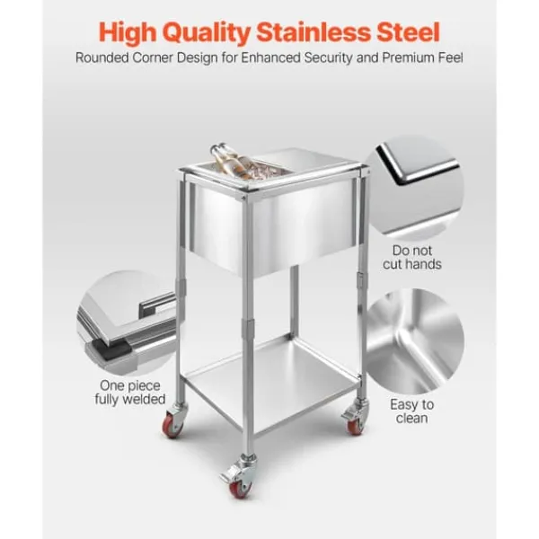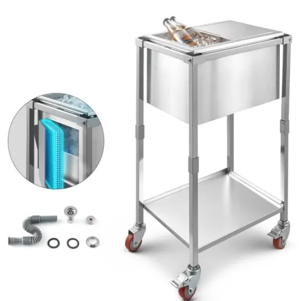 Utrustad med svängbara hjul för enkel transport och en nedre förvaringshylla för optimal organisering. Mycket lämplig för restauranger, hotell, internetcaféer och fester, och perfekt även för utomhusbruk utan behov av kylskåp.