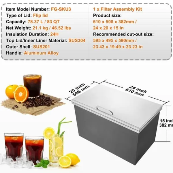 Med sin imponerande kapacitet är denna isbehållare perfekt för alla tillfällen som kräver stora mängder is eller kalla drycker. Den exceptionella isoleringsförmågan gör att den håller dryckerna kylda i timmar utan behov av elektricitet. Dess livsmedelskvalitetsmaterial är både hållbart och rostbeständigt och ger en långvarig lösning för kylbehov. Den enkla installationen och det smarta filterröret gör användningen till en lätthet. Dess inbäddade installation är idealisk för olika platser och sparar ovärderligt utrymme.