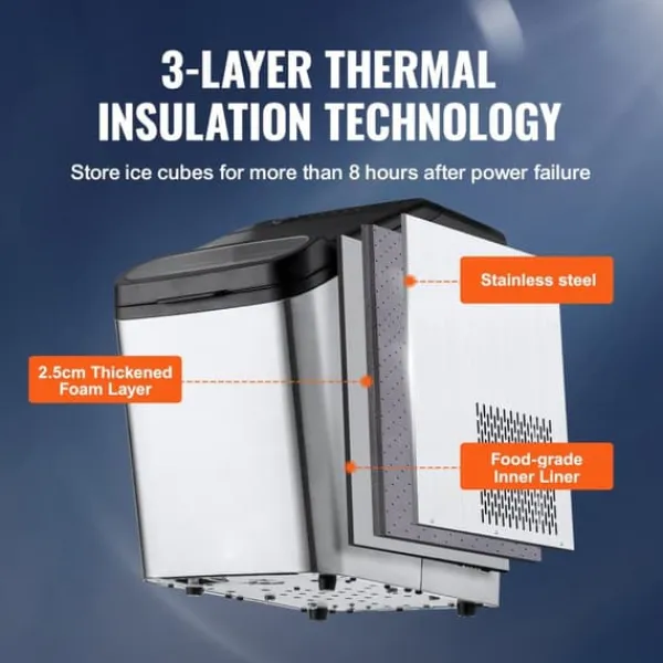 -Keep the cold in: Den bärbara ismaskinen har ett 2,5 mm skumlager, ska av rostfritt stål och tre lager isoleringsmaterial, vilket gör att den kan hållas i över 8 timmar vid strömavbrott.