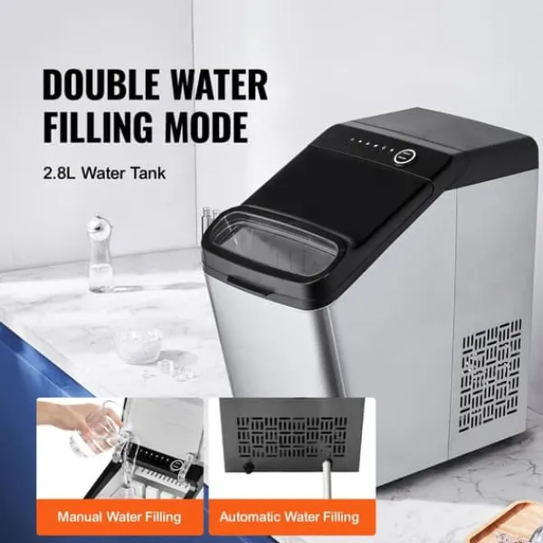 -Denna bärbara ismaskin producerar 33 lbs is per 24 timmar (vid 70°F testmiljö och 59°F inloppsvattentemperatur) och kan förbereda 9 isbitar på 7 minuter. Med en kapacitet på 3,3 lbs är den lätt att ta med sig till fester och picknickar. Njut av ren is när som helst.