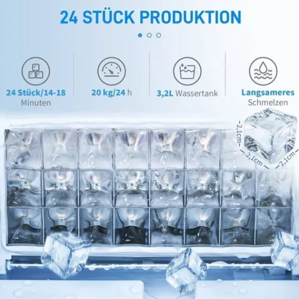 – 24 isbitar på en gång: Så tar aldrig isen slut på festerna! Vår kraftfulla ismaskin producerar 24 fasta, fyrkantiga isbitar (som smälter långsammare) på bara 14-18 minuter och upp till 20 kg is per dag. Och med knapparna ”+,-” kan du ställa in tjockleken på dina isbitar exakt.
