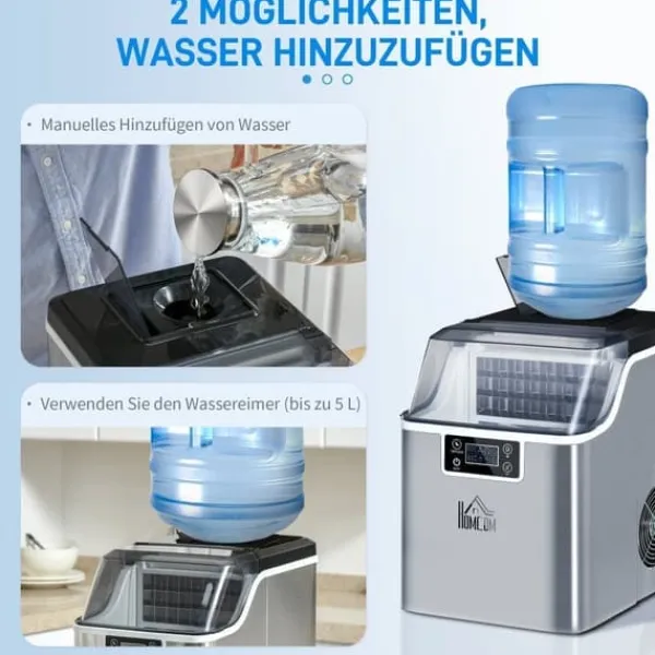 – 2 sätt att tillsätta vatten: Fyll på vatten manuellt (upp till 3,2 l) eller ställ en vattenflaska på upp till 5 l (ingår ej) direkt på ismaskinen i rostfritt stål. Njut av en kontinuerlig tillgång till isbitar utan avbrott