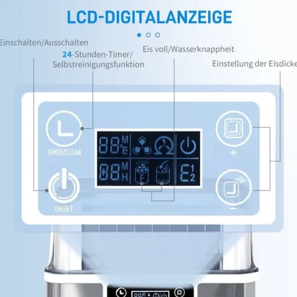 – Användarvänlig: Visar när korgen är full. Visar också när vattennivån är låg – så att du vet när du behöver fylla på vatten i ismaskinen. Enkel att använda. Dessutom kan du följa hela isframställningsprocessen genom ett fönster.