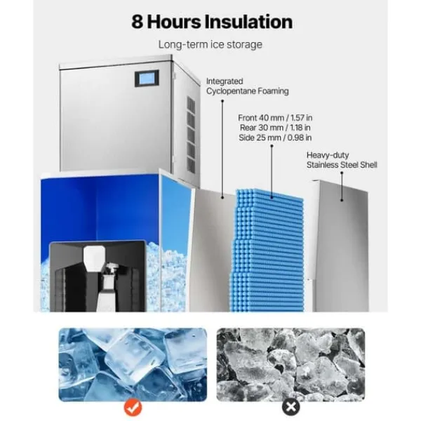 Den här kommersiella ismaskinen är perfekt för att snabbt producera stora mängder is. Med en kapacitet att producera 360 lbs is per dygn och en isdispenser som kan ge dig upp till 20 lbs isbitar per minut, är denna maskin idealisk för kontinuerlig användning.