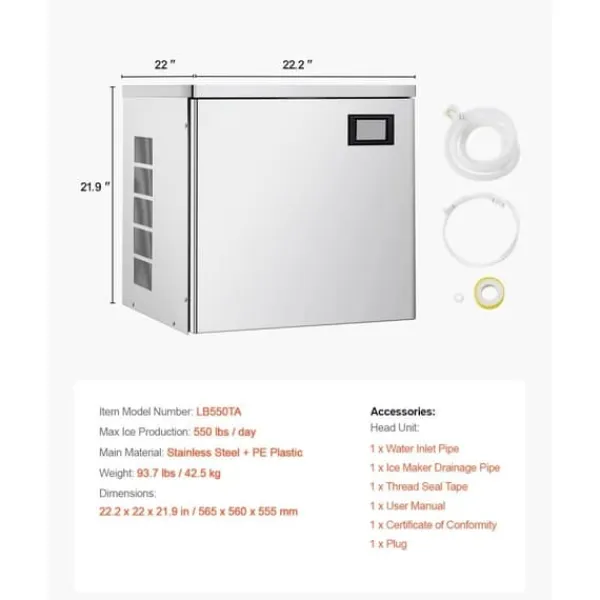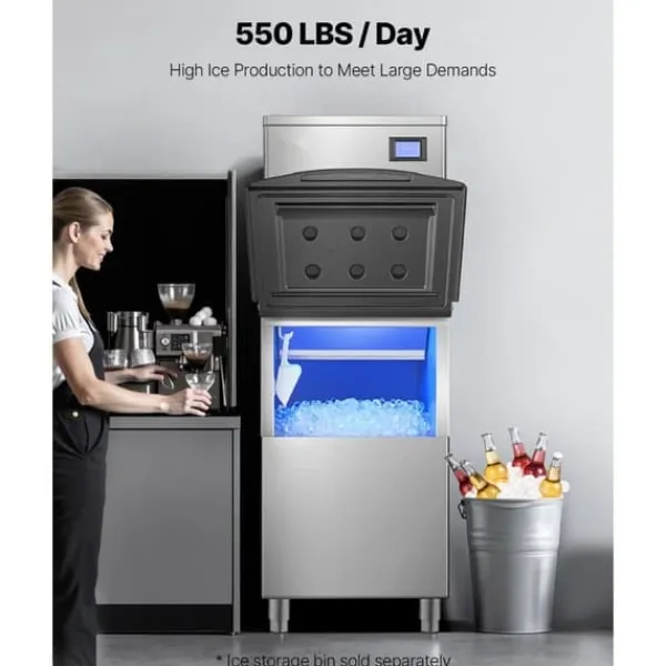 Stor isproduktion: Den kommersiella ismaskinen kan producera 550 lbs is per 24 timmar, vilket motsvarar ungefär 15 000 isbitar, och garanterar en kontinuerlig tillförsel av is i stora mängder.