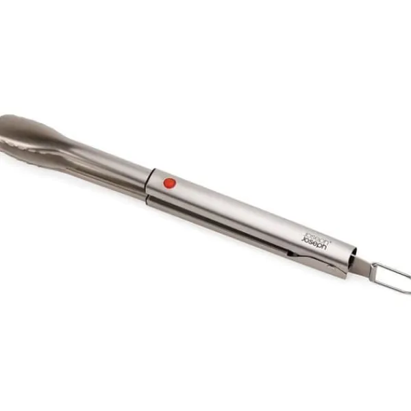 Dessa högkvalitativa grilltänger är utrustade med en hållbar struktur i rostfritt stål och har smidiga och nedfällbara armar för kompakt förvaring. Du behöver bara trycka på den röda knappen för att fälla ut armarna i full längd innan användning. Tängerna har tänder i ändarna för noggripande grepp under matlagningen, vilket gör dem idealiska för en mängd olika uppgifter.