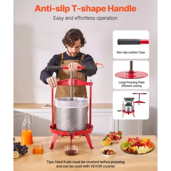 Designen med stor kapacitet på 14L/3,69 gallon är idealisk för familjesammankomster, fester, vingårdar, och gårdar för att bekvämt producera riklig juice. För bästa resultat av juicepress, förkrossa frukter med en fruktkross innan pressning.
