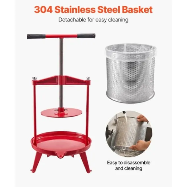 Fruktvinpressen är byggd med en solid tvärbalk i gjutjärn och kan svängas upp, vilket gör det bekvämt att ladda korgen eller placera frukter direkt inuti. Den triangulära basen säkerställer stabilitet och säker placering på marken. Levereras med två filterpåsar av livsmedelskvalitet, vilket säkerställer säker och hygienisk användning.