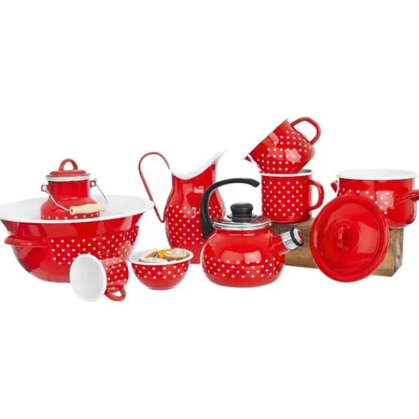 ✅ EMALJERAD – Tillverkad av röd emaljerad stålkanna av högsta kvalitet. Den har ett vitt prickigt motiv. Emaljen som behållaren är täckt med är ett hälsovänligt material och även säkert för allergiker. Handtaget är tillverkat av metall och trä av högsta kvalitet.