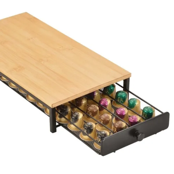Stabil konstruktion: Kaffekapselstället är tillverkat av svart pulverlackerat järn och en robust bambuskiva, vilket ger en stabil och säker förvaring för upp till 40 kapslar. Denna kombination av material säkerställer långvarig användning och ett modernt utseende som passar i alla kök.