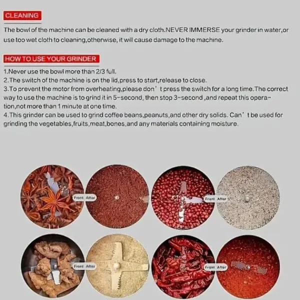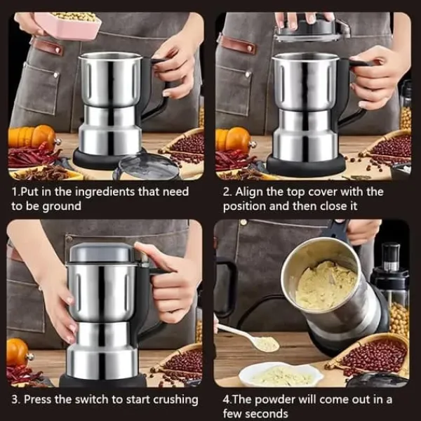 Effektivisera matlagning och kaffebryggning med denna elektriska multifunktionella kvarn. Med en 4-bladig stålkniv i 304 rostfritt stål mals kaffebönor, kryddor, spannmål och andra ingredienser snabbt och jämnt, vilket ger bästa resultat varje gång.