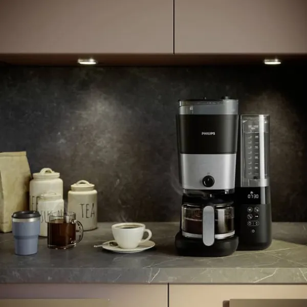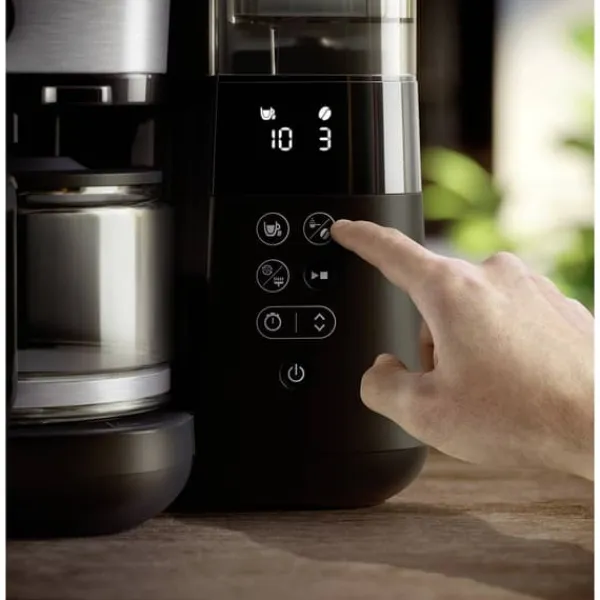 Inbyggd kvarn med inställbar malningsgrad Med den integrerade konformade kvarnen kan malningsgraden anpassas efter önskemål, så att kaffeons arom kan utvecklas fullt ut. Du kan även stänga av malverk och använda färdigt kaffepulver. Allt-i-1 broms Med All-in-1 Brew kan du brygga kaffe i en glas- eller termokanna eller direkt i din favoritmugg eller favoritmugg Förbered muggen och njut på väg till jobbet. Smart dosering: Perfekt förhållande mellan vatten och kaffe vid varje bryggning Den smarta doseringen ger perfekt vatten/kaffeförhållande vid varje bryggning, vilket gör det enkelt att göra en tillredning med mindre frekvent påfyllning. För ett perfekt kaffe som aldrig smakar i vatten eller sur smak. Avtagbar Duo-behållarkapacitet för kaffebönor Tack vare den avtagbara Duo-kaffebönbehållaren med aromskyddslock kan du spara två olika typer av kaffebönor och mixa eller växla mellan koffeinerat och normalt kaffe. Behållaren kan tack vare den medföljande borsten dessutom lätt rengöras och fyllas på. Droppstopp-funktion Droppar på kaffet på under tutan hör till det förgångna. Med droppstoppfunktionen kan du hälla upp en kopp kaffe innan bryggningen är klar. Kaffebryggaren pause kort, så att du kan ge ditt kaffe och först därefter fortsätta bryggningen. Bekväm påfyllning av den avtagbara vattentanken Tack vare den smarta doseringen behöver du inte fylla på vatten vid varje bryggning. Och när vattenbehållaren måste fyllas på med en kapacitet på upp till 10 koppar och en lättläst vattennivåindikering, kan den med det inbyggda handtaget enkelt separeras från kaffebryggaren och hållas under kranen. Energisnål och säker med automatisk avstängnings- och varmhållningsfunktion Kaffebryggaren stängs av automatiskt efter tillagning, eller kan hålla kaffet varmt i upp till 5 timmar. Ställ in när kaffebryggaren ska börja tillaga På LED-displayen kan du se tidsprogrammeringen av bryggningen. Ställ in när kaffebryggaren ska börja tillredningen för att vakna av doften från nybryggt kaffe på morgonen. Uppfriskande iskaffe för varma sommardagar Kaffe för hela året! Njut av en varm kopp kaffe under vintermånaderna, eller unna dig en uppfriskande kaffe under varma sommardagar. Utrymmessnål design, passar på arbetsytan under köksskåpet Kaffebryggaren kan, tack vare en mycket utrymmesbesparande design, utan problem placeras under köksskåp utan att du behöver kompromissa med kapaciteten. Led-visning för individuell kaffenjutning helt efter din smak LED-display som är lätt att läsa Dessutom kan intensiteten (steg 1 till 3), antalet koppar (1 till 10) och målgraden ställas in individuellt. Njut av kaffe med den perfekta bryggtemperaturen helt efter din smak. Aroma-Twister för en bättre smakupplevelse Aroma-Twister fördelar kaffets arom jämnt i kannan och ger på så sätt en bättre smakupplevelse. OBS! Vi beklagar att vi inte har hunnit översätta