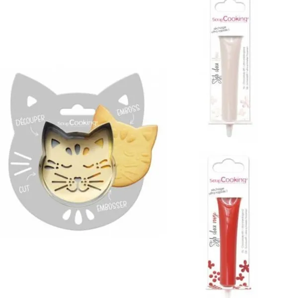 Detta set med utstansare och präglare samt två färgade chokladpennor kommer att vara de perfekta tillbehören för att skapa och dekorera kakor, småkakor eller alla andra bakspecialiteter i kattform! Den noggrant utformade utstansaren och präglaren ger din kaka en kattform och trycker djurets detaljer i relief, rita eller skriv sedan på dem med chokladpennorna. Perfekt att ge som present till en bakentusiast eller för att imponera på dina vänner och din familj vid desserttillfället! Kitet inkluderar en kattutstansare av rostfritt stål och en kattpräglare i naturligt trä samt två chokladsmaksatta livsmedelspennor. Tvätta och torka av utstansaren och präglaren före första användning och mellan varje användning. Dessa två tillbehör är återanvändbara: tvättbara och rostfria för att baka på ett originellt och ekologiskt sätt! Präglare i trä ska inte användas i ugn, diskmaskin eller under vatten. För att rengöra den, använd en lätt fuktig svamp. Dessa två tillbehör kan användas separat. Vrid inte, detta kit är inte ett leksak, låt inte barn ha tillgång till det. Sätt inte spetsen i direkt kontakt med en låga eller på en elektrisk platta. Använd inga vassa verktyg. Dimensioner utstansare: 6,4 x 7,2 x 2,5 cm. Dimensioner präglare: 6,2 x 6,6 x 0,2 cm. Chokladpennorna på 25g är framställda av gelésocker och livsmedelsfärger som gör dem 100% ätbara. Användningen av pennan är mycket enkel: koka vatten i en kastrull, häll det i en skål och placera pennan i den i 2 minuter med korken på. För att använda den, öppna korken och tryck på pennan för att skapa dina dekorationer, ultrarapid torkning! Efter varje användning kan du sätta på korken igen och förvara den. Våra chokladpennor finns även i andra färger.