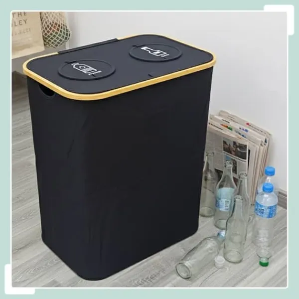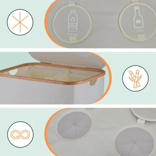 Denna återvinningsbehållare är designad för effektiv sortering och insamling av glas- och plastflaskor, vilket gör den idealisk för kök, källare eller tvättstugor. Den har två avtagbara innerpåsar för enkel tömning och dolda öppningar för att förhindra lukt, allt kombinerat i en modern design med naturliga bambudetaljer.