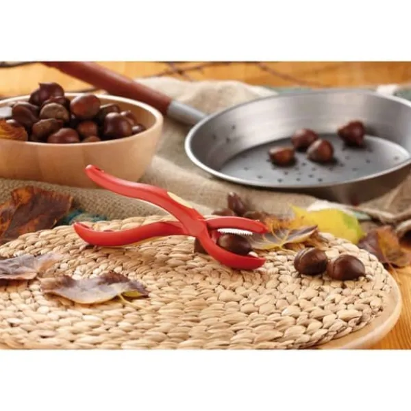 Denna röda kastanjekniv är tillverkad av rostfritt stål och plast, med en längd på 19,5 cm. Dess lutande tänder håller kastanjen på plats och förhindrar att den glider. Idealisk för praktisk och effektiv användning.