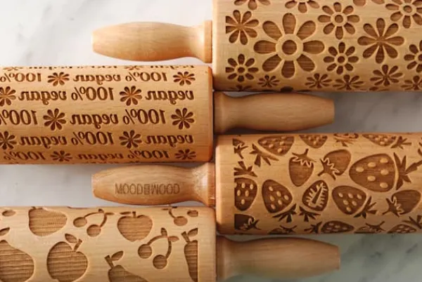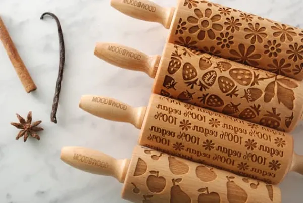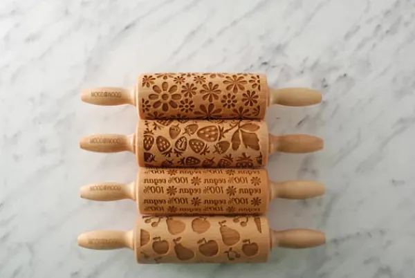 Kavlar-MoodForWood Träkavel 25 cm med handtag, set om 4, graverad, perfekt för bakning – Veganskt setmönster
