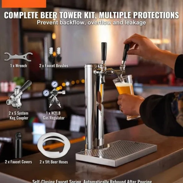 Tillverkad av premium 304 rostfritt stål, erbjuder dubbla kranar öltornet exceptionell hållbarhet och tillförlitlighet, idealiskt för både kommersiella och hemmabruk. Denna kegeratortornsats innehåller 2 STK 5 fot ölslang, 2 S-system fatkopplingar, 1 dual gauge W21.8 regulator, 2 krannycklar, 2 rengöringsborstar, 2 krankåpor, 1 droppbricka för öl och en uppsättning monteringstillbehör.