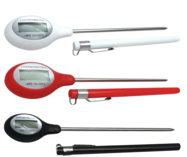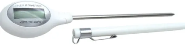 Elektronisk stifttermometer för mätning av matens temperatur. Lättläst LCD-display. Indikerar temperatur från -20C till 200C. Finns i olika färger