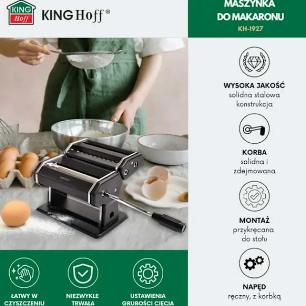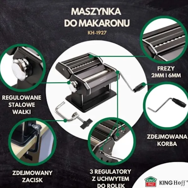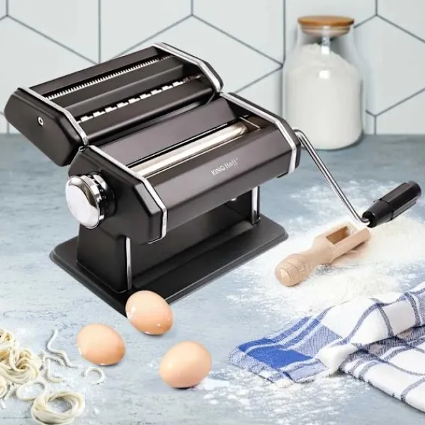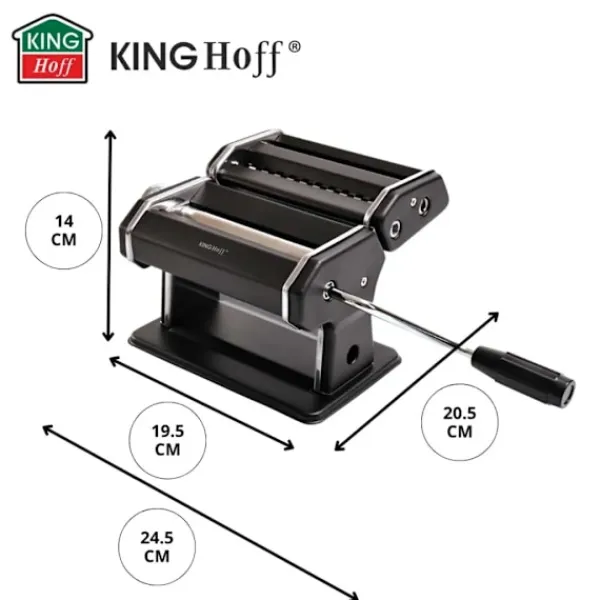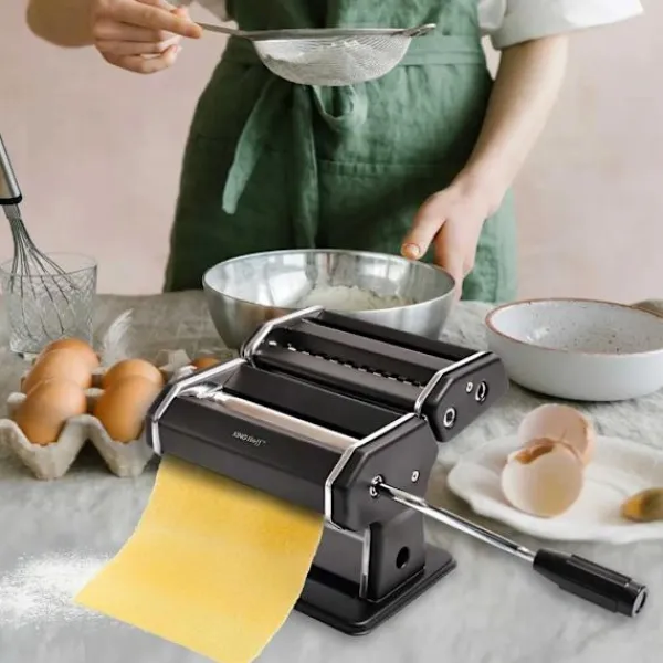 KINGHOFF KH-1927 är designad för att ge dig en högkvalitativ upplevelse. Den robusta stålstrukturen garanterar lång hållbarhet och ett stilrent utseende. Med handdrift och vev kan du enkelt styra processen utan behov av elektricitet, vilket ger dig friheten att skapa när som helst. Justera tjockleken på degen för att passa olika pastatyper, och med de utbytbara knivarna kan du enkelt skära tagliatelle (6 mm) och linguine (2 mm) med precision.