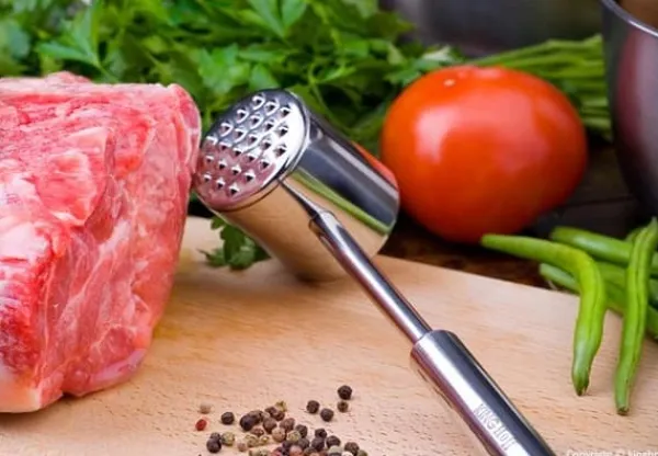 Köttmörning, stål, dubbelsidig, 27x5cm. Yta med pyramider för att bryta nöt- och fläsk, slät yta för fågel och fisk.