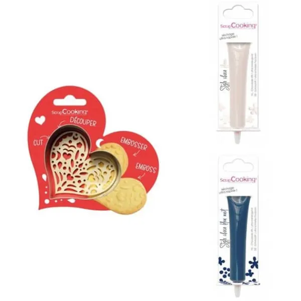 Detta set med pepparkaksform och stämplar samt två färgade chokladpennor blir de perfekta tillbehören för att skapa och dekorera kakor, småkakor eller alla andra bakverk i hjärtform! Den exakta designen på pepparkaksformen och stämplarna ger din kaka en hjärtform och präglar detaljerna av hjärtat i relief, rita eller skriv sedan på med chokladpennorna. Perfekt att ge som present till en bakentusiast eller för att imponera på dina vänner och familj vid desserttillfället! Kitet innehåller en hjärtformad pepparkaksform i rostfritt stål och en hjärtstämplare i naturligt trä samt två ätbara chokladpennor. Tvätta och torka pepparkaksformen och stämplarna före första användning och mellan varje användning. Dessa två tillbehör är återanvändbara: tvättbara och rostfria för en originell och ekologisk bakning! Stämplaren i trä tål inte ugn, diskmaskin eller kontakt med vatten. För att rengöra, använd en lätt fuktig svamp. Dessa två tillbehör kan användas separat. Vrid inte, detta kit är inte en leksak, håll det utom räckhåll för barn. Sätt inte spetsen i direkt kontakt med eld eller på en elektrisk platta. Använd inga vassa verktyg. Mått på pepparkaksform: 6,4 x 7,2 x 2,5 cm. Mått på stämplare: 6,2 x 6,6 x 0,2 cm. Chokladpennorna på 25g är skapade av gelésocker och livsmedelsfärgämnen som gör dem 100% ätbara. Användningen av pennan är mycket enkel: koka vatten i en kastrull, häll det i en skål och lägg i pennan i 2 minuter med korken på. För att använda den, öppna korken och tryck på pennan för att göra dina dekorationer, ultrsnabb torkning! Efter varje användning kan du sätta på korken igen och förvara den. Våra chokladpennor finns även i andra färger.