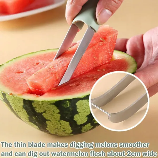 Newvenper-skäraren kombinerar tre verktyg i ett – en vattenmelonkniv, en serveringsgaffel och en glassform. Detta gör att du snabbt och bekvämt kan tillaga vattenmelon och skapa hälsosam, fruktig glass till dina barn.