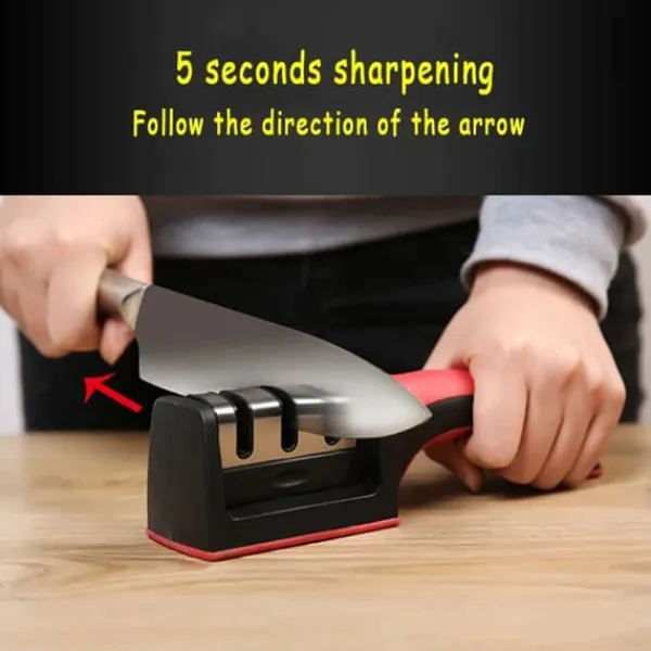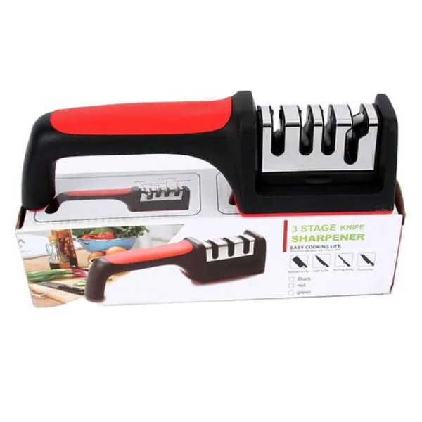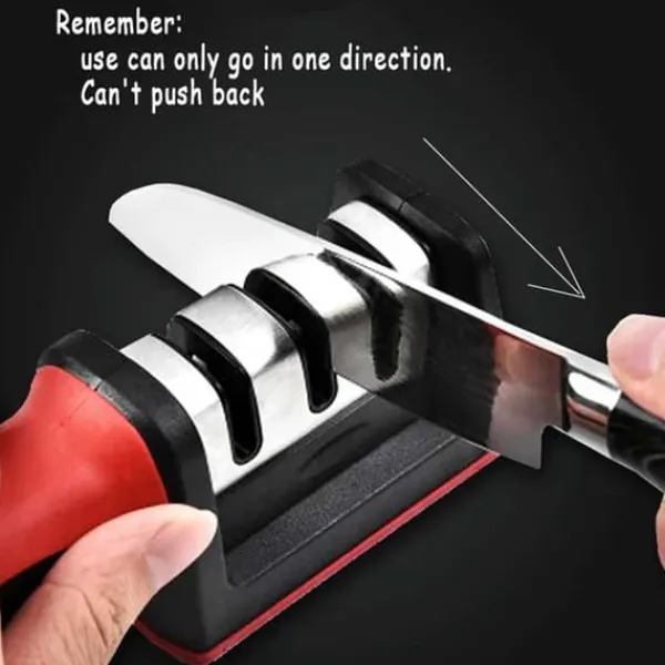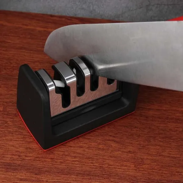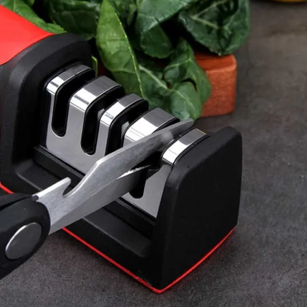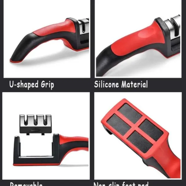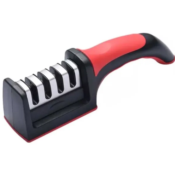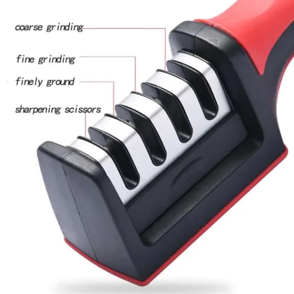 Vässa knivar och saxar på några sekunder hemma! Denna multifunktion knivslip har 4 olika grovheter samt ett ergonomiskt format skaft och halkskydd på både grepp och undersida.