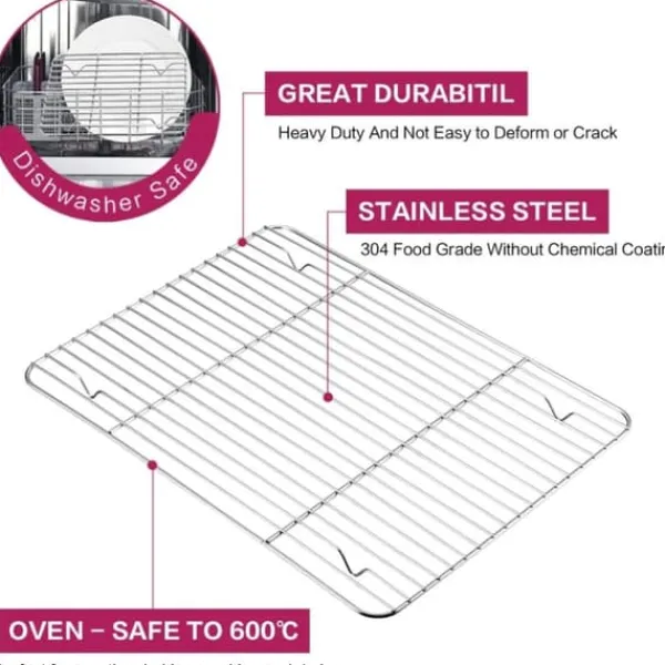 1、 Ingen galvanisering, ingen beläggning, så det finns ingen anledning att oroa sig för kemikalier, skalar av skräp i maten. Hela gallret är tillverkat av rostfritt stål av livsmedelskvalitet 304. Professionella bakställ är förtroendebeständiga och kräver inte täta byten 2、 Robust struktur, solid fyra fots svetsning, god styrka och hållbarhet, motstånd mot vridning och skakning. Höjden på 1,5 cm lyfter maten och låter luften cirkulera runt pannan för perfekt tillagning och kylning utan att vända maten.