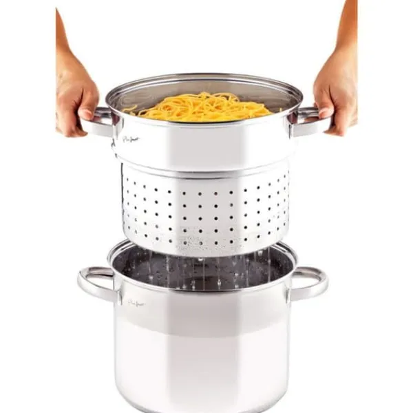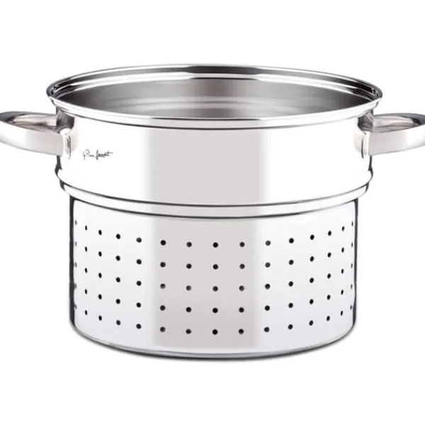 Kastrull för pasta tillverkad av högkvalitativ rostfritt stål. Denna 18/0 rostfria kastrull av första klass har en tjock sandwichbotten. Den inre kastrullen av rostfritt stål 18/10 fungerar som ångkokare eller sil och har sina egna bekväma handtag för självständig hantering.