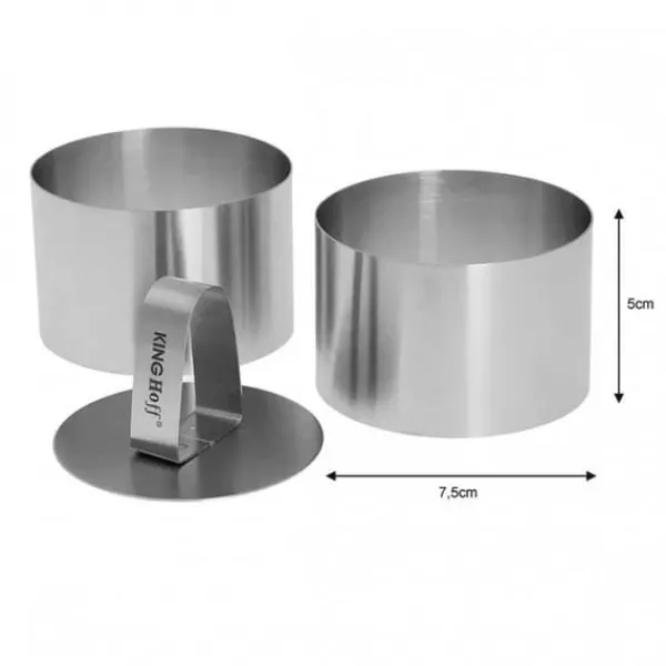 En uppsättning runda formar för att forma desserter, ris, potatis, gryn etc. Stålkolven gör det lättare att fylla och forma fatet. Specifikation: – tillverkad av högkvalitativt rostfritt stål, satinfinish – dimensioner: diameter. 7,6 cm, höjd 5 cm – två runda formar med en klämma