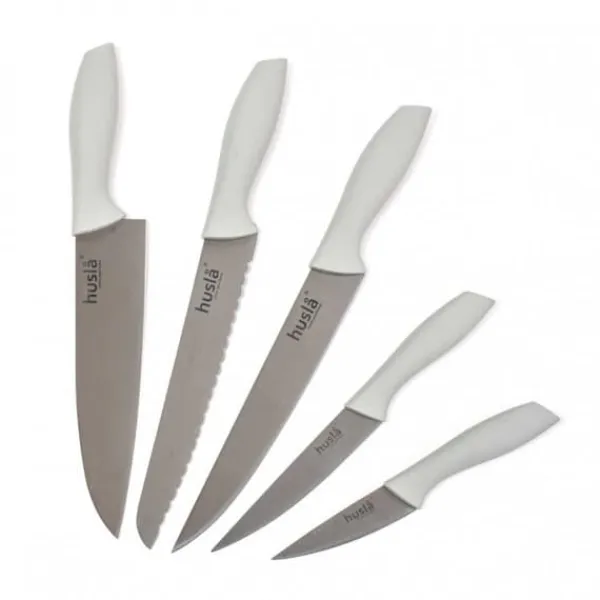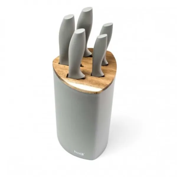 Det designgrå, matta blocket med element i akaciaträ och en uppsättning av 5 knivar av mycket högkvalitativt rostfritt stål gör den imponerande med sin elegans och soliditet vid första anblicken. Naturligt akaciaträ ger dessutom vår produkt en varm bild. Tack vare detta känns det bra i alla köksinredningar. Mjuka handtag belagda med ett tunt lager silikon i kombination med en ergonomisk form gör att arbeta med dem till ett sant nöje. SÄTTET INNEHÅLLER: KOKKNIV 20 CM, BRÖDKNIV 20 CM, KÖTTKNIV 20 CM, BRUKSKNIV 12,5 CM. PELNINGSKNIV 8,5 CM. KÖKSKNIVAR GÅR INTE DISKMASKIN I DISKMASKINEN. Allt är förpackat i en elegant kartong