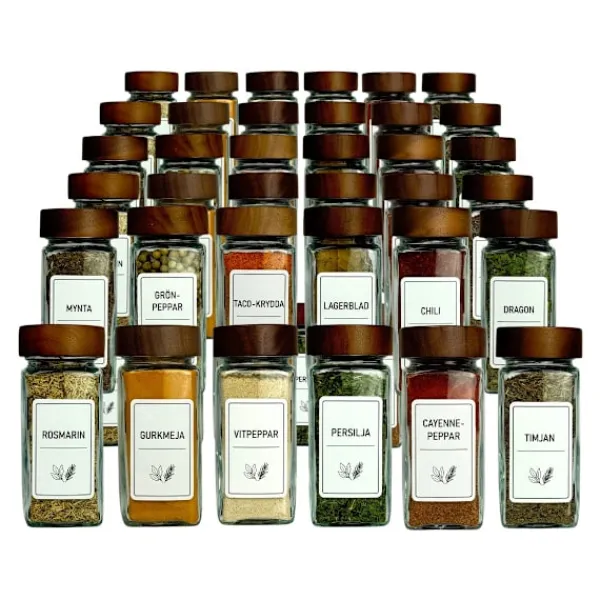 Det här 36-packet kryddburkar i glas med mörkbruna akaciaträlock är för dig som vill ha full kontroll på hela kryddsamlingen och samtidigt ge köket en exklusiv känsla. Perfekt för matälskare, större hushåll eller dig som helt enkelt har många kryddor hemma.