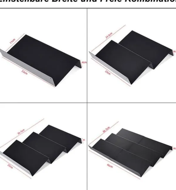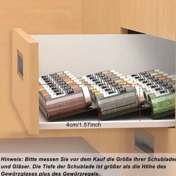 Detta kryddställ består av 6 separata delar, uppdelade i 3 lager. De kan användas separat eller kombineras två och två, justeras från 23 cm till 46 cm för att passa olika storlekar på kryddburkar. Oavsett längden på din låda kan du justera det för att passa perfekt.
