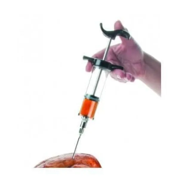 Köksprutan FORTUNAT är ett nytt professionellt verktyg som är oumbärligt i ditt kök. Den låter dig injicera såser, extrakt och kryddblandningar i ditt kött för att ge det smak efter eget tycke. Tillverkad med en graderad kropp i akryl och en nål av rostfritt stål, har den en längd på 22 cm och en diameter på 3 cm.