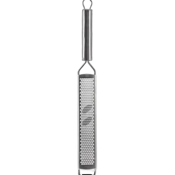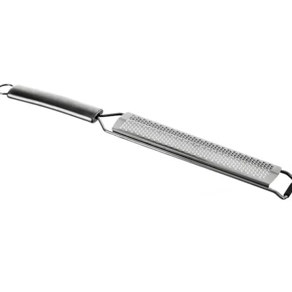 Platt rivjärn, 38 cm lång. Tillverkad av rostfritt stål. Perfekt för att riva ost, citron, choklad, ingefära, kanel och muskotnöt.