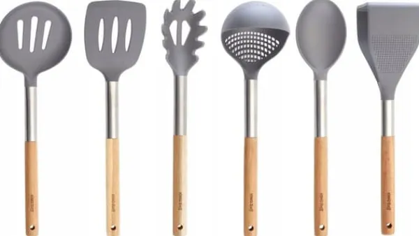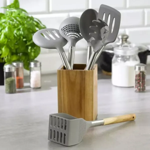 En uppsättning köksredskap av akaciaträ och termoplastisk nylon. Redskap dedikerade till disk med teflon och keramiska beläggningar som är känsliga för repor. – Endast ekologiska och säkra material användes. – Nylondel som tål temperatur upp till 200°C – Produkter som inte repar ytan, avsedda för alla typer av disk. – På grund av det naturliga träet som används som handtag rekommenderas inte diskmaskinsrengöring. I setet ingår stativ i akaciaträ, mått 10,5 x 10,5 x 16,5 cm. I setet ingår: 1 x hålslev 1 x klassisk sked 1 x pastasked 1 x spatel med hål 1 x slevsked 1 x potatisstötare