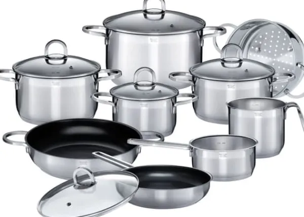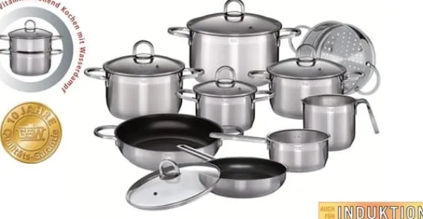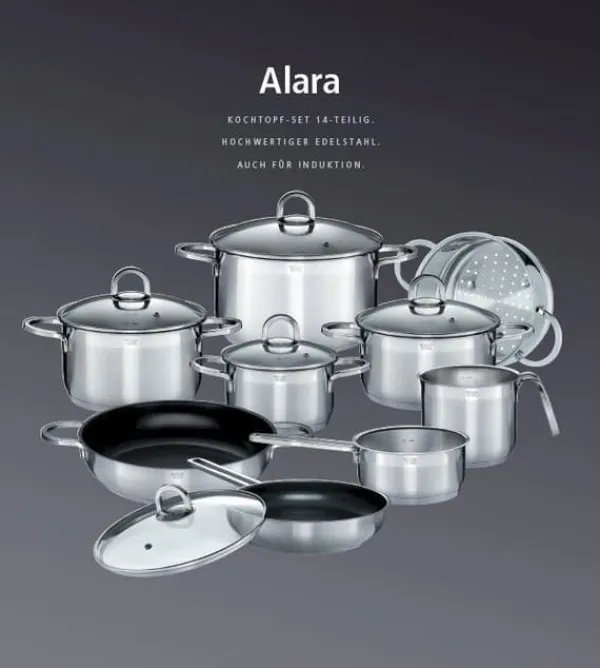 ALARA 14 st induktionsset. Massivt stål 1810. Innehåller holländsk ugn 20cm, grytor 16/20 och 24 cm, gryta 16cm, stekpanna 28cm, stekpanna 24cm, ångkorg 20cm, mjölk kanna 14cm och lock.