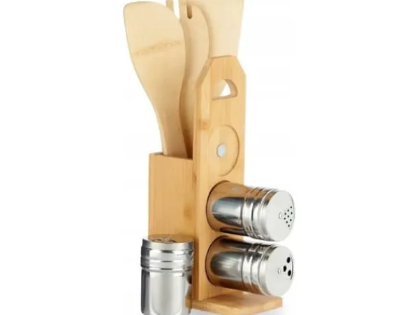 Kinvara med kökstillbehör i stativ, med kryddbehållare i metall