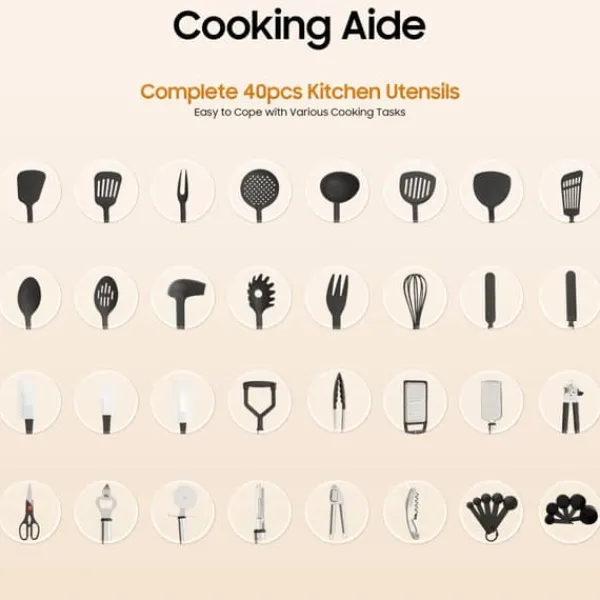 - Komplett 40-delars set för alla köksuppgifter.