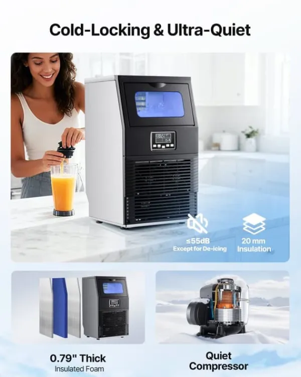 Den tysta kompressorn och ljudnivån på ≤55 dB ger en behaglig miljö i kök eller bar. Den effektiva isoleringen håller isen kall längre så att du slipper frekvent påfyllning.