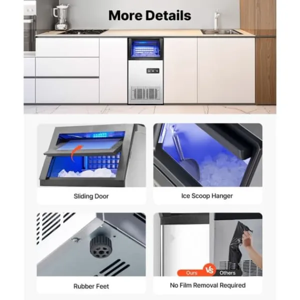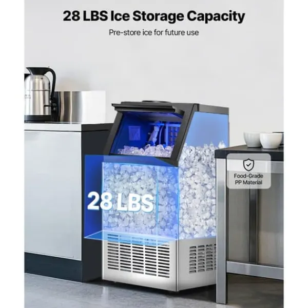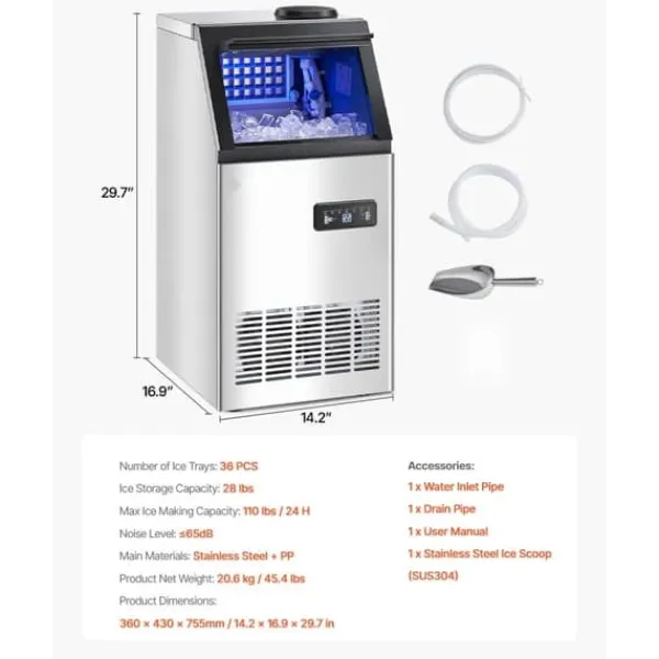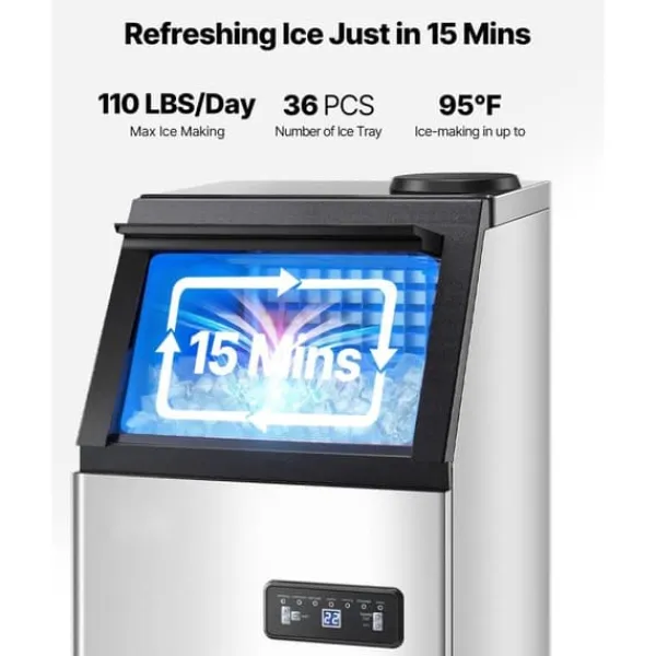 Denna kommersiella ismaskin är designad med 36 isbrickor och kan producera upp till 110 lbs is per dag (testförhållanden: 50-100,4℉/10-38℃ omgivningstemperatur). Med en generös lagringskapacitet på 28 lbs är denna kompakta ismaskin perfekt för hemmet, kaféer, barer, restauranger och mer.
