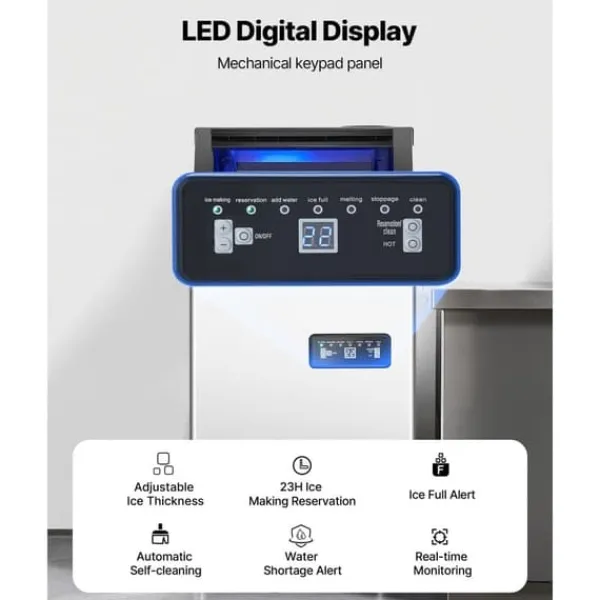 Med en digital LED-display och mekaniska knappar ger den här ismaskinen dig full kontroll över istillverkningsprocessen. Justera istjockleken enkelt genom att reglera tiden och övervaka maskinens status i realtid.