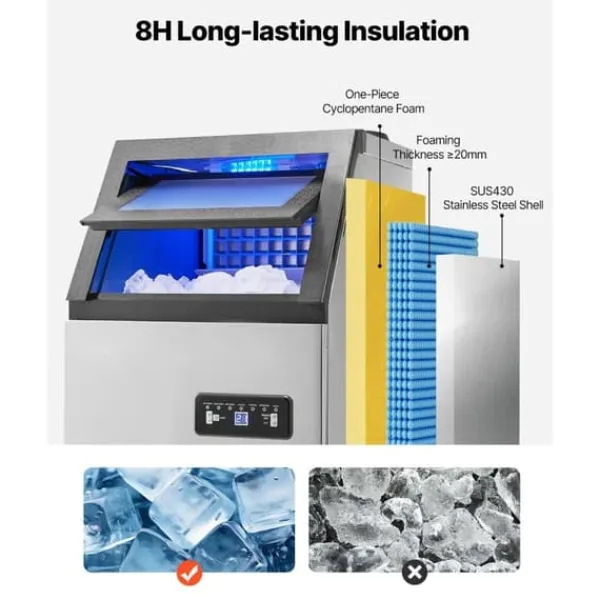 Denna ismaskin tar isolering till en ny nivå med en tjock isolering och kvalitetsskal som säkerställer att dina isbitar förblir frostiga i upp till 6-8 timmar, även när maskinen är avstängd.