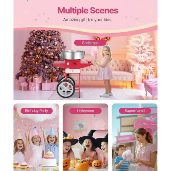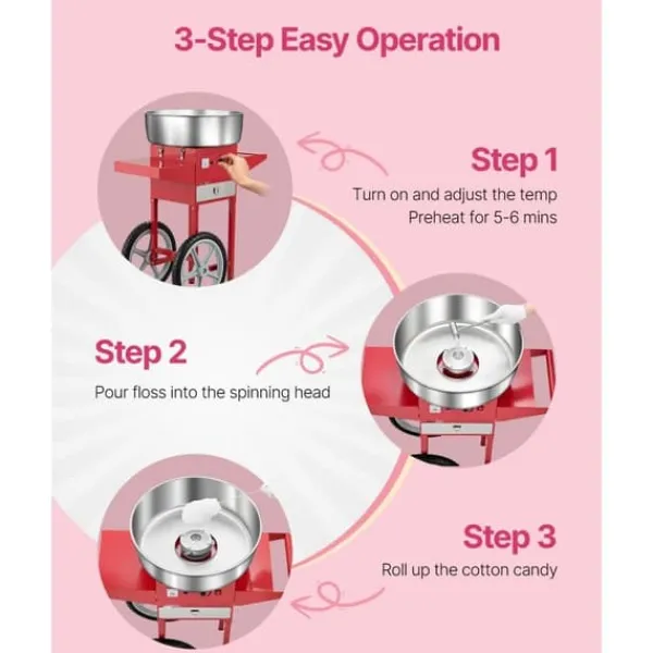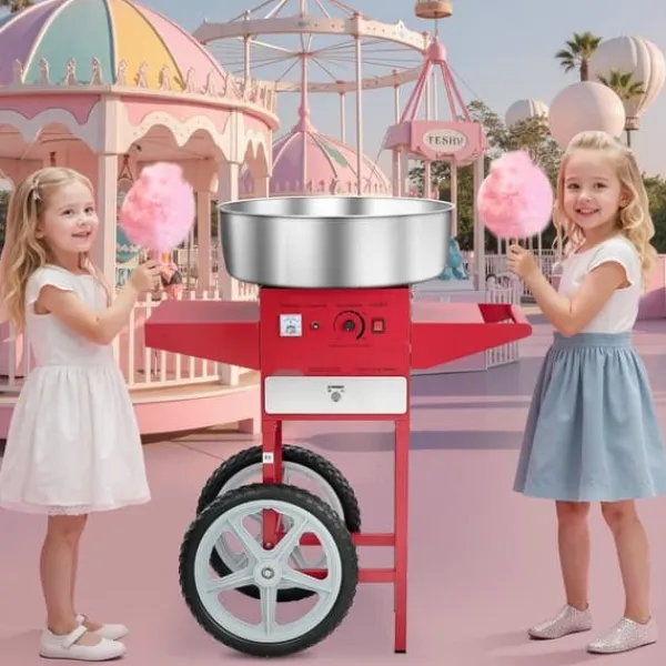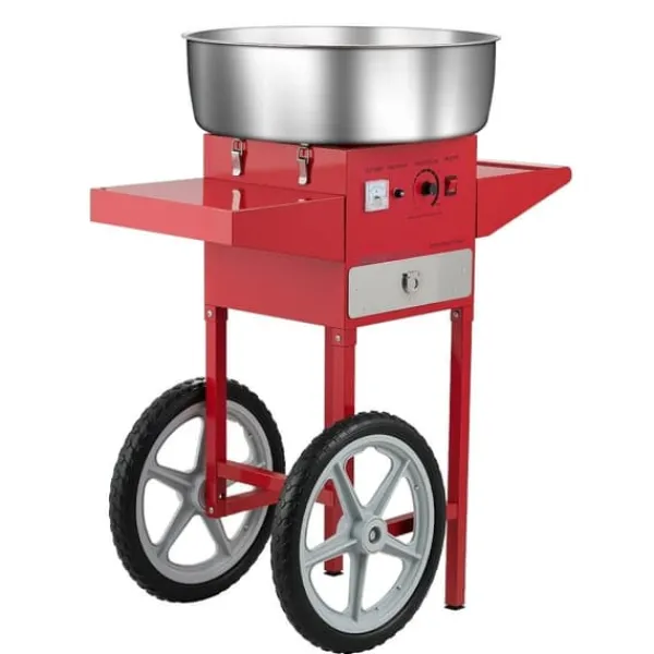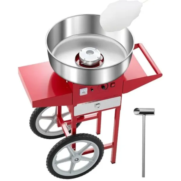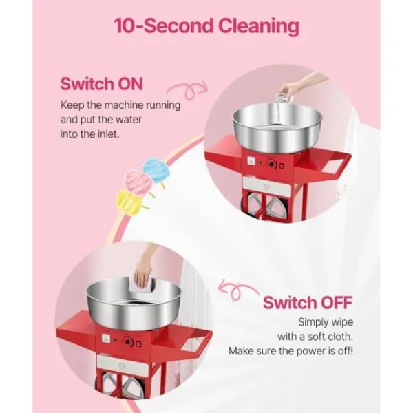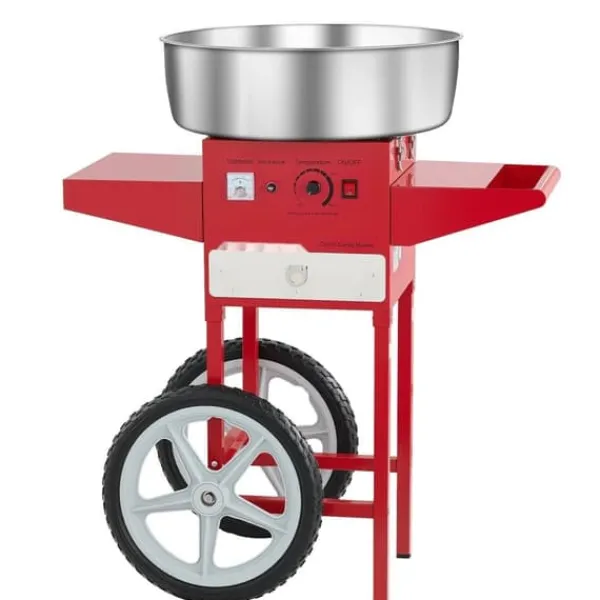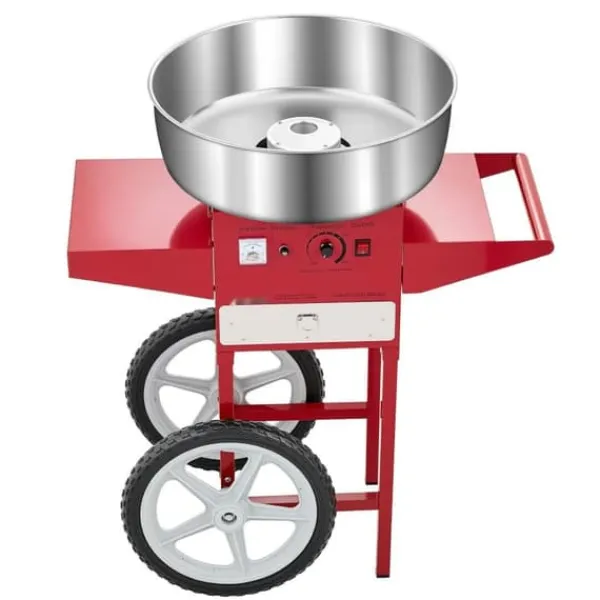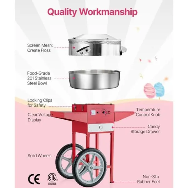 Arbeta med olika godisar: Vår bomullsmaskin med vagn gör att du kan använda olika godisar som traditionellt socker, mjölksocker eller fruktbitar för att göra läckra sockervaddsstrutar. Den är perfekt för fester som karnevaler, festivaler och sportevenemang.